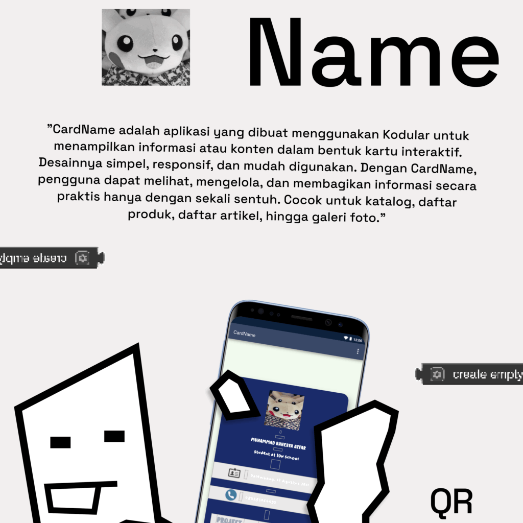 “CardName adalah aplikasi yang dibuat menggunakan Kodular untuk menampilkan informasi atau konten dalam bentuk kartu interaktif. Desainnya simpel, responsif, dan mudah digunakan. Dengan CardName, pengguna dapat melihat, mengelola, dan membagikan informasi secara praktis hanya dengan sekali sentuh.