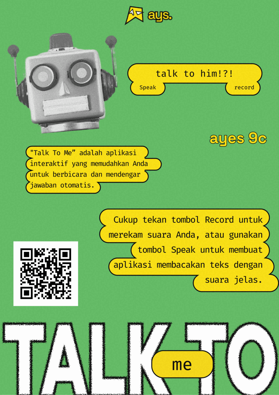 “Talk To Me adalah aplikasi interaktif yang memudahkan Anda untuk berbicara dan mendengar jawaban otomatis. Cukup tekan tombol Record untuk merekam suara Anda, atau gunakan tombol Speak untuk membuat aplikasi membacakan teks dengan suara jelas.
